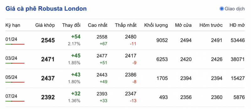 Giá cà phê Robusta trên sàn London ngày 27/11/2023 duy trì mức tăng, từ 32-54 USD/tấn, dao động từ 2.392 - 2.545 USD/tấn. Cụ thể, kỳ hạn giao hàng tháng 1/2024 là 2.545 USD/tấn (tăng 54 USD/tấn); kỳ hạn giao hàng tháng 3/2024 là 2.471 USD/tấn (tăng 45 USD/tấn); kỳ hạn giao hàng tháng 5/2024 là 2.437 USD/tấn (tăng 43 USD/tấn) và kỳ hạn giao hàng tháng 7/2024 là 2.392 USD/tấn (tăng 32 USD/tấn).