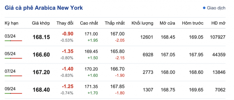 Trái ngược, giá cà phê Arabica trên sàn New York sáng ngày 27/11 có xu hướng giảm nhẹ, dao động từ 166,60 - 168,40 cent/lb tuỳ từng kỳ hạn giao hàng. Cụ thể, kỳ hạn giao hàng tháng 3/2024 là 168,15 cent/lb; kỳ giao hàng tháng 5/2024 là 166,60 cent/lb; kỳ giao hàng tháng 7/2024 là 167,20 cent/lb và kỳ giao hàng tháng 9/2024 là 168,40 cent/lb.