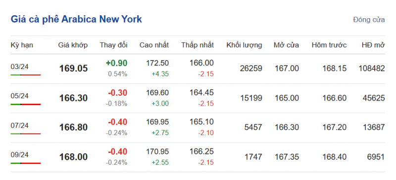 Trái ngược, giá cà phê Arabica trên sàn New York sáng ngày 28/11 có xu hướng hỗn hợp, tăng ở kỳ hạn gần và giảm ở kỳ hạn xa. Cụ thể, dao động từ 166,30 - 169,05 cent/lb tuỳ từng kỳ hạn giao hàng. Cụ thể, kỳ hạn giao hàng tháng 3/2024 là 169,05 cent/lb; kỳ giao hàng tháng 5/2024 là 166,30 cent/lb; kỳ giao hàng tháng 7/2024 là 166,80 cent/lb và kỳ giao hàng tháng 9/2024 là 168,00 cent/lb.