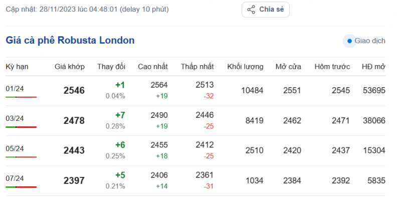 | Giá Arabia và Robusta mới nhất ngày 28/11/2023 |