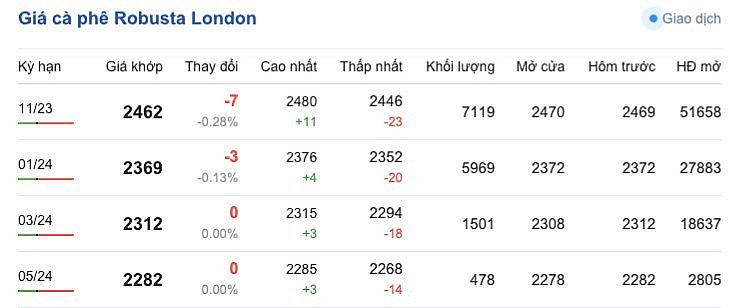 Kết thúc phiên giao dịch, giá cà phê Robusta trên sàn London ngày 30/9/2023 sau phiên tăng hôm qua hôm nay giảm trở lại, mức giảm không đáng kể, cao nhất là 7 USD/tấn. Cụ thể, kỳ hạn giao hàng tháng 11/2023 là 2.462 USD/tấn (giảm 7 USD/tấn); kỳ hạn giao hàng tháng 1/2024 là 2.369 USD/tấn (giảm 3 USD/tấn), kỳ hạn giao hàng tháng 3/2024 là 2.312 USD/tấn (tăng 19 USD/tấn), kỳ hạn giao hàng tháng 5/2024 là 2.282 (tăng 14 USD/tấn).