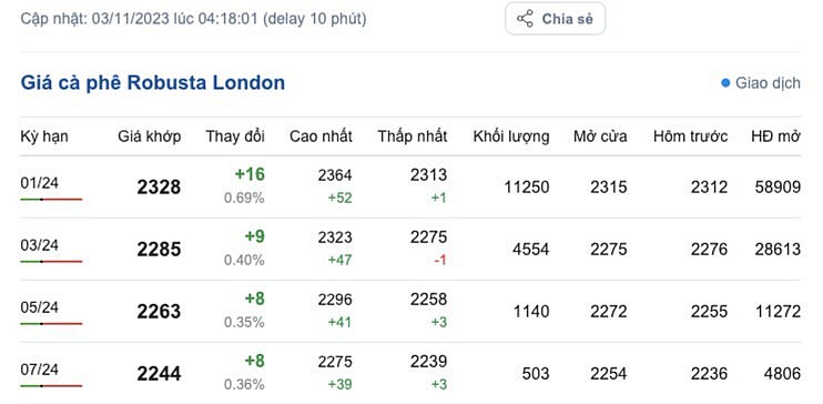 | Giá Arabia và Robusta mới nhất ngày 3/11/2023 |