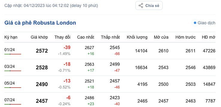 Giá cà phê Robusta trên sàn London ngày 4/12/2023 ổn định so với phiên giao dịch trước đó, dao động từ 2.423 - 2.627 USD/tấn. Cụ thể, kỳ hạn giao hàng tháng 1/2024 là 2.572 USD/tấn; kỳ hạn giao hàng tháng 3/2024 là 2.528 USD/tấn; kỳ hạn giao hàng tháng 5/2024 là 2.490 USD/tấn và kỳ hạn giao hàng tháng 7/2024 là 2.457 USD/tấn.