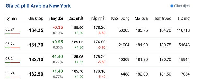 Tương tự, giá cà phê Arabica trên sàn New York sáng ngày 4/12 ổn định, dao động từ 174,80 - 188,50 cent/lb tuỳ từng kỳ hạn giao hàng. Cụ thể, kỳ hạn giao hàng tháng 3/2024 là 184,35 cent/lb; kỳ giao hàng tháng 5/2024 là 181,70 cent/lb; kỳ giao hàng tháng 7/2024 là 182,10 cent/lb và kỳ giao hàng tháng 9/2024 là 182,90 cent/lb.
