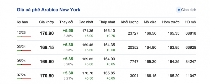 Tương tự, giá cà phê Arabica trên sàn New York sáng ngày 5/11 xu hướng tăng, mức tăng trên từ 3% so với phiên giao dịch trước đó, dao động từ 164,35 - 171,35 cent/lb tuỳ từng kỳ hạn giao hàng. Cụ thể, kỳ hạn giao hàng tháng 12/2023 là 170,90 cent/lb (tăng 5,55 cent/lb); kỳ giao hàng tháng 3/2024 là 169,15 cent/lb (tăng 5,30 cent/lb); kỳ giao hàng tháng 5/2024 là 169,60 cent/lb và kỳ giao hàng tháng 7/2024 là 170,50 cent/lb.