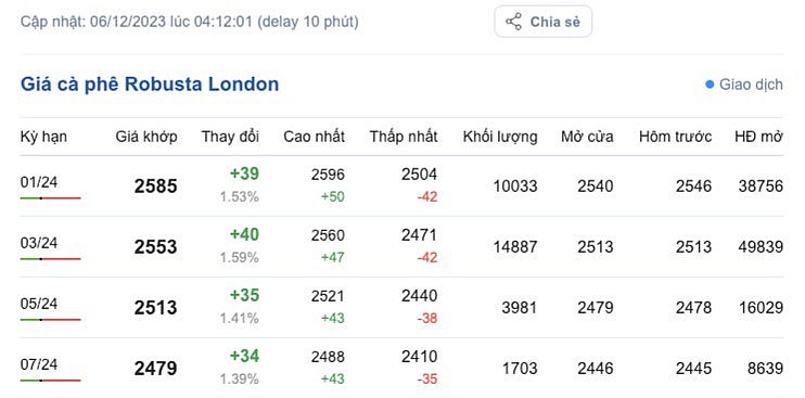 Giá cà phê Robusta trên sàn London ngày 6/12/2023 đảo chiều tăng mạnh so với phiên giao dịch trước đó, dao động từ 2.410 - 2.596 USD/tấn. Cụ thể, kỳ hạn giao hàng tháng 1/2024 là 2.585 USD/tấn (tăng 39 USD/tấn); kỳ hạn giao hàng tháng 3/2024 là 2.553 USD/tấn (tăng 40 USD/tấn); kỳ hạn giao hàng tháng 5/2024 là 2.513 USD/tấn (tăng 35 USD/tấn) và kỳ hạn giao hàng tháng 7/2024 là 2.479 USD/tấn (tăng 34 USD/tấn).