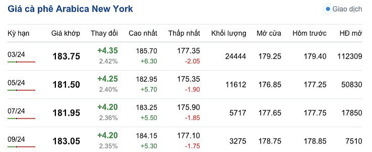 Tương tự, giá cà phê Arabica trên sàn New York sáng ngày 6/12 xu hướng tăng, mức tăng trên 2%, dao động từ 175,35 - 185,70 cent/lb tuỳ từng kỳ hạn giao hàng. Cụ thể, kỳ hạn giao hàng tháng 3/2024 là 183,75 cent/lb (tăng 2,42%); kỳ giao hàng tháng 5/2024 là 181,50 cent/lb (tăng 2,40%); kỳ giao hàng tháng 7/2024 là 181,95 cent/lb và kỳ giao hàng tháng 9/2024 là 183,05 cent/lb.
