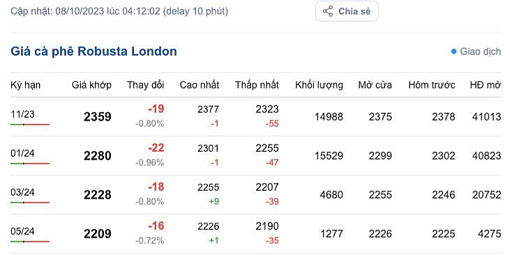 Kết thúc phiên, giá cà phê Robusta trên sàn London ngày 8/10/2023 có xu hướng ổn định so với phiên giao dịch trước đó, tuy nhiên, sắc đỏ chiếm ưu tại các kỳ hạn giao hàng, dao động từ 2.190 - 2.377 USD/tấn. Cụ thể, kỳ hạn giao hàng tháng 11/2023 là 2.359 USD/tấn; kỳ hạn giao hàng tháng 1/2024 là 2.280 USD/tấn; kỳ hạn giao hàng tháng 3/2024 là 2.228 USD/tấn và kỳ hạn giao hàng tháng 5/2024 là 2.209 USD/tấn.