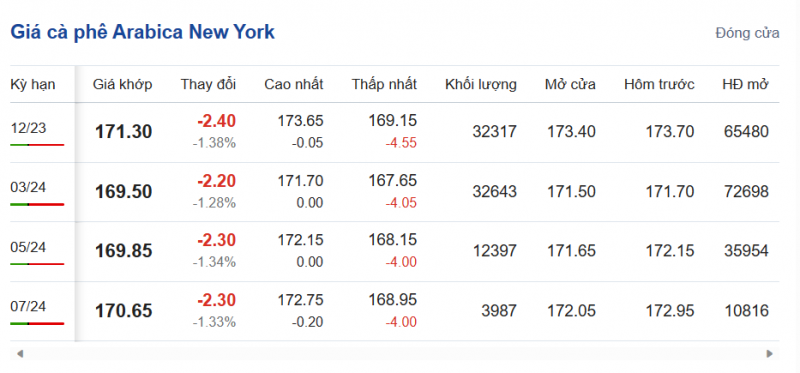 Tương tự, giá cà phê Arabica trên sàn New York sáng ngày 8/11 cũng có mức giảm nhẹ. Cụ thể, kỳ hạn giao hàng tháng 12/2023 là 171,30 cent/lb (giảm 2.40 cent/lb); kỳ giao hàng tháng 3/2024 là 169.50 cent/lb (giảm 2.20 cent/lb); kỳ giao hàng tháng 5/2024 là 169,85 cent/lb và kỳ giao hàng tháng 7/2024 là 170,65 cent/lb.