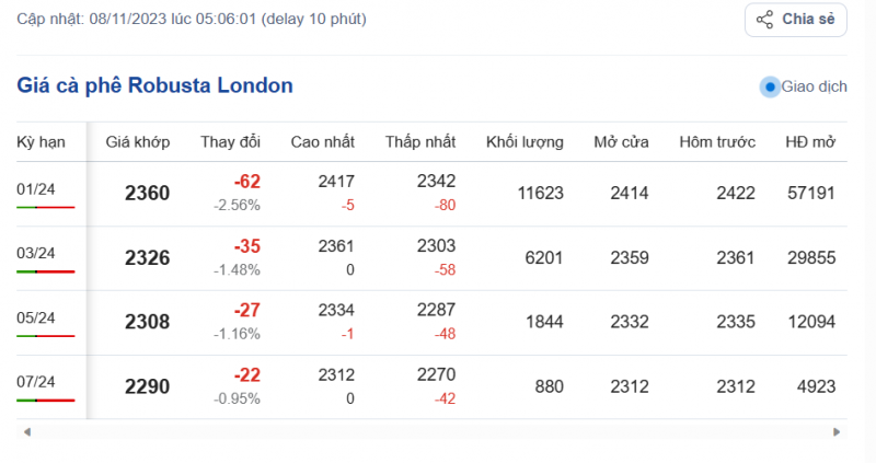 Kết thúc phiên giao dịch, giá cà phê Robusta trên sàn London ngày 8/11/2023 có mức giảm mạnh nhẹ, dao động từ 2.290 - 2.360 USD/tấn. Cụ thể, kỳ hạn giao hàng tháng 1/2024 là 2.360 USD/tấn (giảm 62 USD/tấn); kỳ hạn giao hàng tháng 3/2024 là 2.326 USD/tấn (giảm 35 USD/tấn); kỳ hạn giao hàng tháng 5/2024 là 2.308 USD/tấn (giảm 27 USD/tấn) và kỳ hạn giao hàng tháng 7/2024 là 2.290 USD/tấn (giảm 22 USD/tấn).
