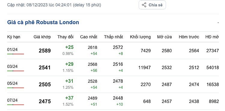 | Giá Arabia và Robusta mới nhất ngày 8/12/2023 |