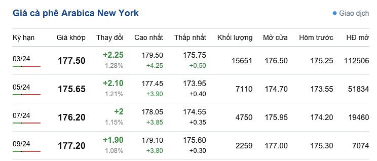 Tương tự, giá cà phê Arabica trên sàn New York sáng ngày 8/12 chuyển sắc xanh, tăng nhẹ mức tăng trên 1% so với phiên giao dịch trước đó, dao động từ 173,95 - 179,50 cent/lb tuỳ từng kỳ hạn giao hàng. Cụ thể, kỳ hạn giao hàng tháng 3/2024 là 177,50 cent/lb (tăng 1,28%); kỳ giao hàng tháng 5/2024 là 175,65 cent/lb (tăng 1,21%); kỳ giao hàng tháng 7/2024 là 176,20 cent/lb (tăng 1,15%) và kỳ giao hàng tháng 9/2024 là 177,20 cent/lb (tăng 1,08%).