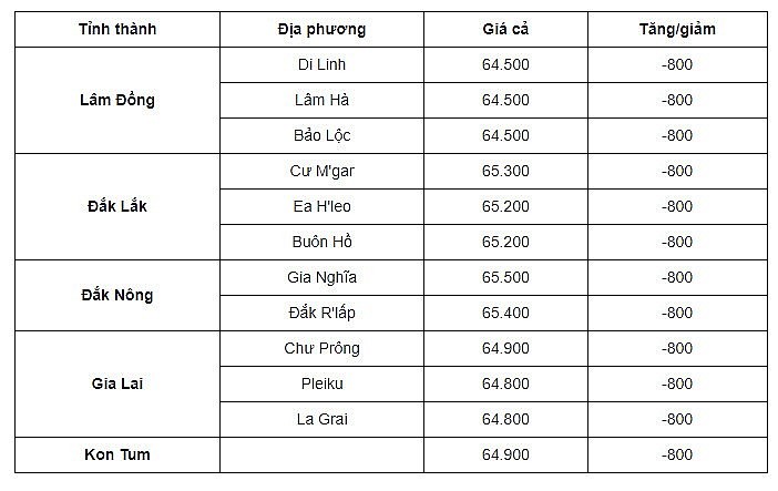 Ở Gia Lai, huyện Chư Prông đang giao dịch với giá 64.900 đ/kg, còn Pleiku và La Grai đang cùng giữ mức 64.800 đ/kg.