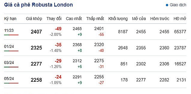 Trong đó, giá Robusta trên sàn London giao tháng 11/2023 giảm tới 49 USD/tấn, xuống mức 2.407 USD/tấn. Và kỳ hạn giao tháng 1/2024 trên sàn này vẫn giảm mạnh 35 USD/tấn, ở mức 2.325 USD/tấn.