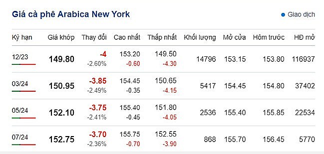 Còn trên sàn New York, giá Arabica giao tháng 12/2023 quay đầu giảm 4 cent/lb; về mức 149,80 cent/lb. Và kỳ hạn giao tháng 3/2024 giảm tới 3,85 cent/lb; ở mức 150,95 cent/lb.