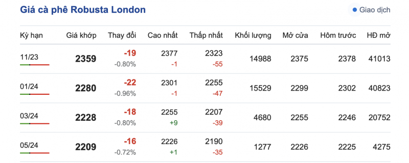 Kết thúc phiên, giá cà phê Robusta trên sàn London ngày 9/10/2023 có xu hướng giảm, sắc đỏ chiếm ưu tại các kỳ hạn giao hàng, dao động từ 2.190 - 2.377 USD/tấn. Cụ thể, kỳ hạn giao hàng tháng 11/2023 là 2.359 USD/tấn; kỳ hạn giao hàng tháng 1/2024 là 2.280 USD/tấn; kỳ hạn giao hàng tháng 3/2024 là 2.228 USD/tấn và kỳ hạn giao hàng tháng 5/2024 là 2.209 USD/tấn.