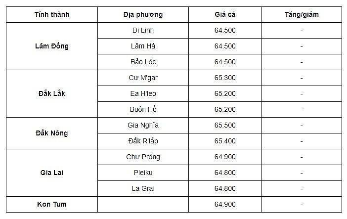 Cụ thể, tại 3 huyện Di Linh, Bảo Lộc và Lâm Hà của tỉnh Lâm Đồng đang đang giao dịch cùng mức 64.500 đ/kg.