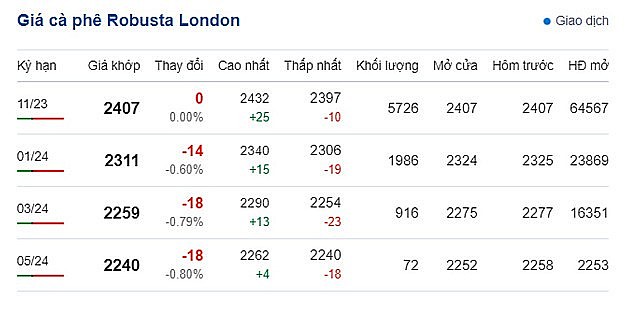 Trong đó, giá Robusta trên sàn London giao tháng 11/2023 đi ngang, giữ ở mức 2.407 USD/tấn. Và kỳ hạn giao tháng 1/2024 trên sàn này giảm thêm 14 USD/tấn, ở mức 2.311 USD/tấn.