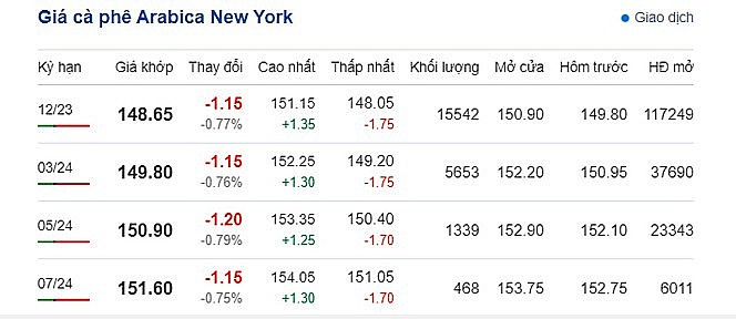 Còn trên sàn New York, giá Arabica giao tháng 12/2023 quay đầu giảm nhẹ 1,15 cent/lb; về mức 148,65 cent/lb. Và kỳ hạn giao tháng 3/2024 cũng giảm thêm 1,15 cent/lb; ở mức 149,80 cent/lb.