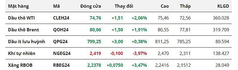 Chốt phiên, giá dầu WTI tăng 2,06% lên 74,76 USD/thùng. Dầu Brent tăng 1,91% lên 80,06 USD.