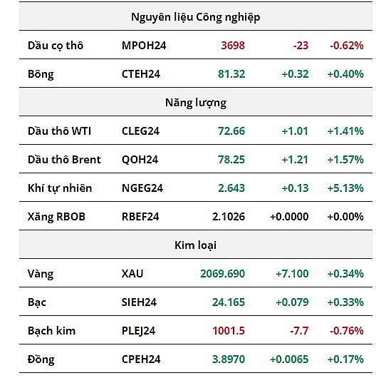 Theo đó, giá dầu (CLEG24 +1,41%) bật tăng mạnh do nguy cơ xung đột Israel - Gaza mở rộng sang khu vực lớn hơn đã gia tăng vào cuối tuần qua. Đáp lại hành động của Mỹ, Iran đã gửi tàu khu trục Alborz qua eo biển Bab El-Mandeb, điểm nghẽn giữa Biển Đỏ và Vịnh Aden, khiến tình hình trở nên biến động hơn tại tuyến đường biển xử lý khoảng 12% thương mại của thế giới. Ngoài ra, thị trường cũng phản ứng tích cực với dữ liệu kinh tế của Trung Quốc, khi PMI sản xuất tháng 12 của Caixin đạt mức cao nhất trong 4 tháng.