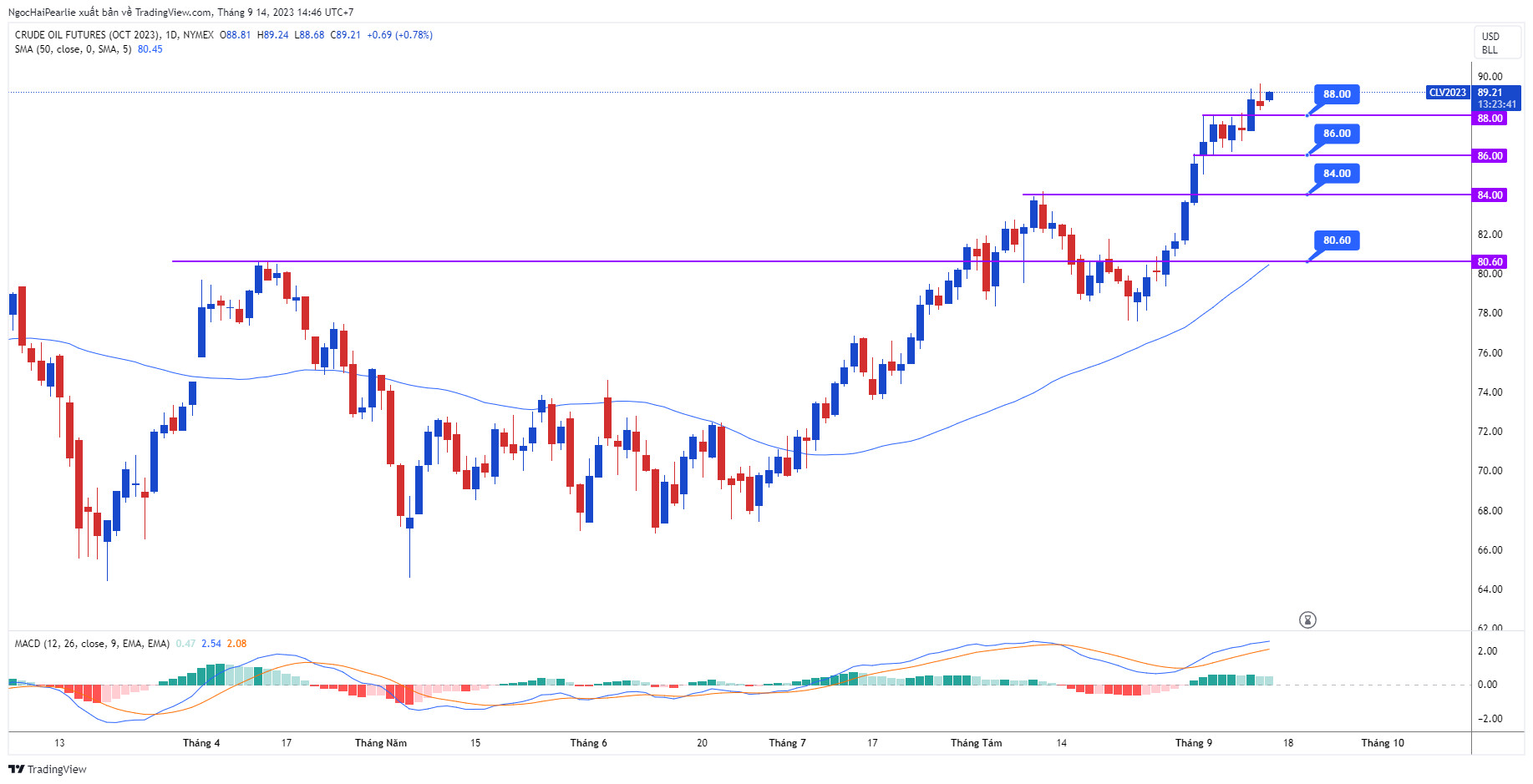 Giá phá vỡ vùng 88 USD/thùng hình thành mẫu hình tăng tiếp diễn, tín hiệu này có thể sẽ vẫn còn kéo dài cho đến khi có tin tức và tín hiệu xác nhận phá vỡ mức 88 USD/thùng.