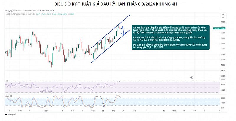 Về mặt kỹ thuật giá dầu, khung 4H, áp lực bán gia tăng khi giá tiến về kháng cự là cạnh trên của kênh tăng ngắn hạn, với sự xuất hiện của hai nến hanging man, theo sau là một nến inverted hammer và một nến spinning top. RSI và Stoch RSI đều đã đi vào vùng quá mua, trong khi hai đường %D và %K của Stoch RSI bắt đầu cắt xuống. Dự báo giá dầu có thể điều chỉnh giảm về cạnh dưới của kênh tăng tại vùng giá 75,2 - 75,5 USD.
