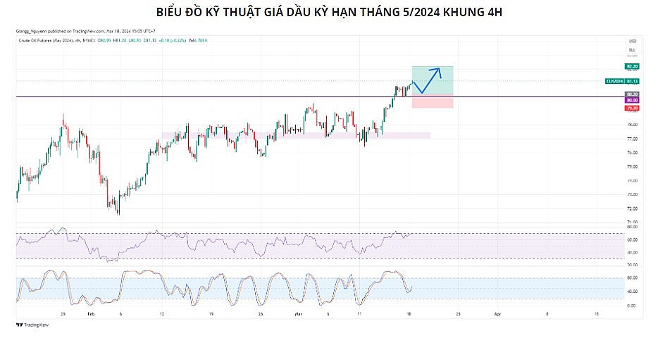 Về mặt kỹ thuật giá dầu, khung 4H, giá duy trì đà tăng mạnh mẽ sau khi backtest thành công vùng hỗ trợ tâm lý 80 USD. Hai đường %D và %K của Stoch RSI cũng bắt đầu cắt lên. Tuy nhiên, RSI có xu hướng phân kỳ âm khi giá tăng nhưng động lực có dấu hiệu đi xuống. Dự báo giá dầu có thể hạ nhiệt về vùng 80,2 - 80,5 USD, trước khi tăng trở lại lên vùng 82 - 82,5 USD. Nhà đầu tư có thể mở vị thế mua tại 80,2 - 80,5 USD, với kỳ vọng chốt lời tại 82 - 82,5 USD và cắt lỗ nếu giá giảm quá 79,2 USD.