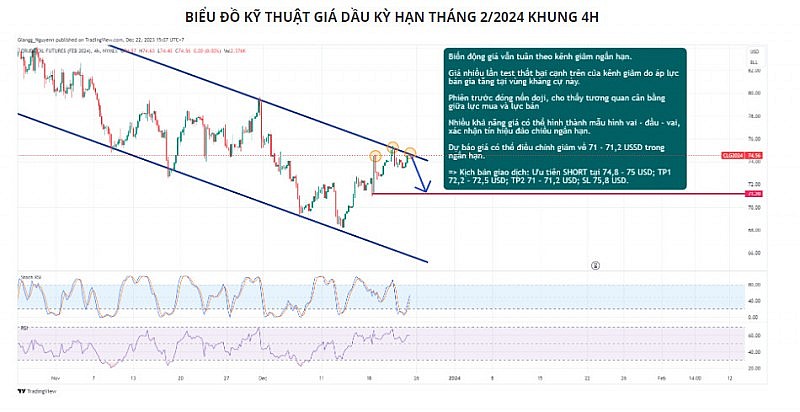 Về mặt kỹ thuật giá dầu, khung 4H, giá nhiều lần test thất bại kháng cự là cạnh trên của kênh giảm. Phiên trước đóng nến doji, cho thấy lực bán gia tăng ngang bằng với lực mua. Nhiều khả năng giá có thể hình thành mẫu hình vai - đầu - vai, xác nhận tín hiệu đảo chiều ngắn hạn với mục tiêu điều chỉnh giảm dự kiến về 71 - 71,2 USD.