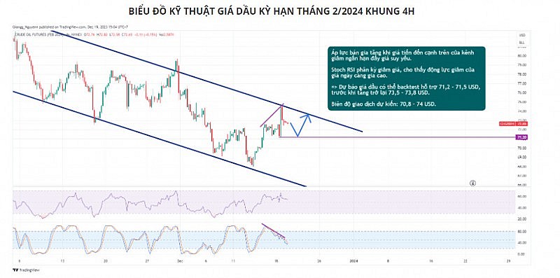 Về mặt kỹ thuật giá dầu, khung 4H, áp lực bán gia tăng tại kháng cự là cạnh trên của kênh giảm ngắn hạn đẩy giá suy yếu. Stoch RSI phân kỳ giảm giá, cho thấy động lực giảm của giá ngày càng cao. Dự báo giá dầu có thể backtest hỗ trợ 71,2 - 71,5 USD, trước khi tăng trở lại 73,5 - 73,8 USD.