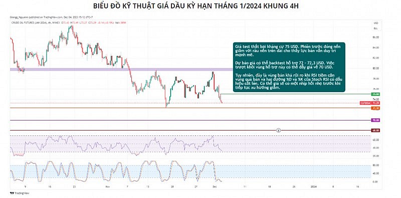 Về mặt kỹ thuật giá dầu, khung 4H, giá test thất bại kháng cự 75 USD. Phiên trước đóng nến giảm với râu nến trên dài cho thấy lực bán vẫn đang áp đảo. Dự báo giá có thể backtest vùng hỗ trợ 72 - 72,3 USD. Việc trượt khỏi vùng hỗ trợ này có thể đẩy giá về 70 USD.