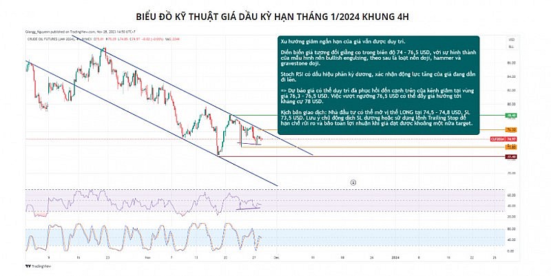 Về mặt kỹ thuật giá dầu, khung 4H, biến động của giá vẫn tuân theo kênh giảm ngắn hạn. Diễn biến giá tương đối giằng co với sự xuất hiện của loạt nến doji, hammer và gravestone doji. Tuy nhiên, động lực tăng của giá đang dần đi lên khi RSI có dấu hiệu phân kỳ dương. Dự báo giá có thể phục hồi từ 74,5 - 74,8 USD và hướng đến cạnh trên của kênh giảm tại vùng giá 76,3 - 76,5 USD.