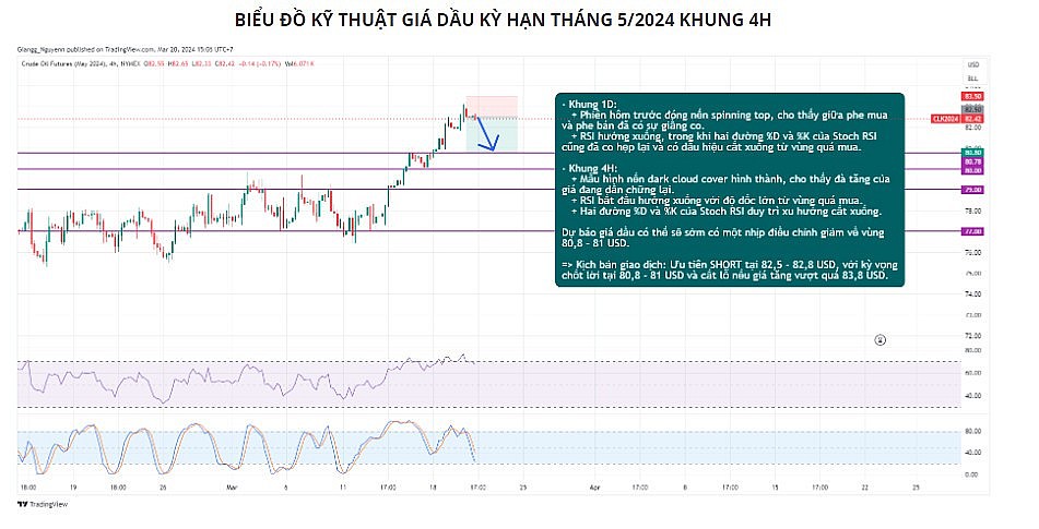 Về mặt kỹ thuật giá dầu, khung 4H, mẫu hình nến dark cloud cover hình thành, cho thấy đà tăng của giá đang dần chững lại. RSI bắt đầu hướng xuống với độ dốc lớn từ vùng quá mua. Hai đường %D và %K của Stoch RSI duy trì xu hướng cắt xuống. Dự báo giá dầu có thể sẽ sớm có một nhịp điều chỉnh giảm về vùng 80,8 - 81 USD.