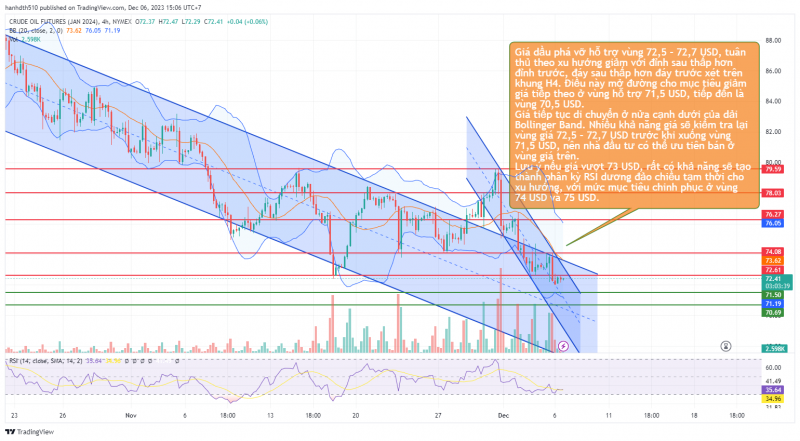 Lưu ý nếu giá vượt 73 USD, rất có khả năng sẽ tạo thành phân kỳ RSI dương đảo chiều tạm thời cho xu hướng, với mức mục tiêu chinh phục ở vùng 74 USD và 75 USD.