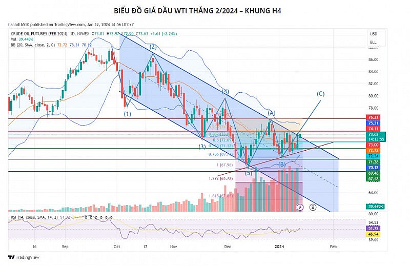Về mặt kỹ thuật, nến liên tục rút chân tại vùng giá 74 USD, cũng là bị chặn ở đường SMA200 khung H4 và cạnh trên của kênh giảm lớn. Dấu hiệu phân kỳ giảm ở khung H1.