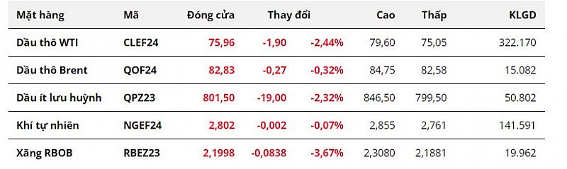 Chốt phiên, giá dầu WTI kỳ hạn tháng 1 giảm 2,44% xuống 75,96 USD/thùng. Dầu Brent cùng kỳ hạn giảm 0,32% xuống 82,83 USD/thùng. Brent kỳ hạn tháng 2/2024 bắt đầu được giao dịch, đã giảm 2,4% xuống 80,86 USD/thùng. Như vậy, so với tháng 10, dầu thô đã đánh mất 6,25% giá trị, ghi nhận tháng giảm giá thứ hai liên tiếp.