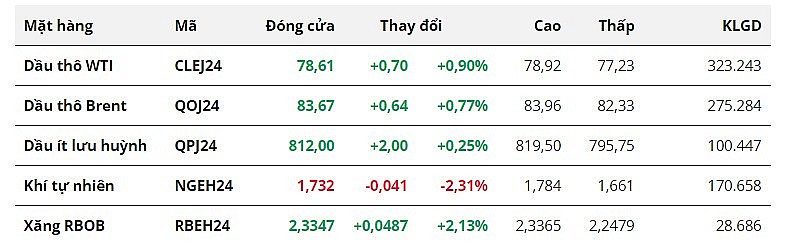 Chốt phiên, giá dầu WTI tăng 0,9% lên 78,61 USD/thùng. Dầu Brent tăng 0,77% lên 83,67 USD/thùng.