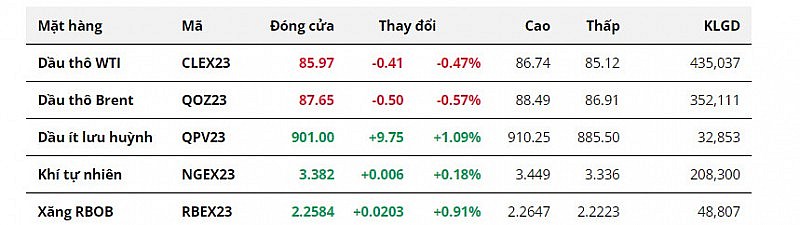 Khép lại phiên giao dịch ngày 10/10, giá dầu suy yếu khi tâm lý thị trường dần ổn định trở lại sau phiên tăng mạnh đầu tuần, do triển vọng nguồn cung tích cực lấn át rủi ro chính trị. Giá dầu WTI chấm dứt tăng 2 phiên liên tiếp khi giảm 0,47% xuống 85,97 USD/thùng. Trong khi đó, giá dầu Brent giảm 0,57% xuống 87,65 USD/thùng.