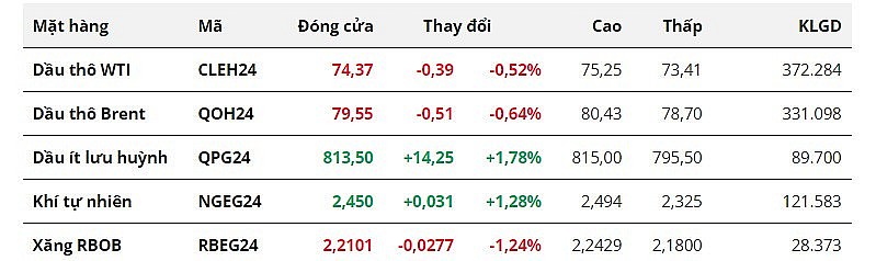 Chốt phiên, giá dầu WTI giảm 0,52% xuống 74,37 USD/thùng. Dầu Brent giảm 0,64% xuống 79,55 USD/thùng.