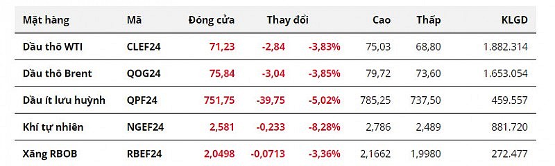 Cụ thể, giá dầu WTI giảm 3,83% xuống 71,23 USD/thùng. Dầu Brent xuống 75,84 USD/thùng sau khi giảm 3,85%.