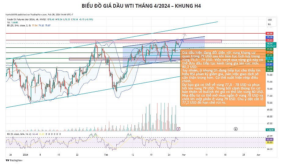 Về mặt kỹ thuật, giá dầu hiện đang đối diện với vùng kháng cự quan trọng 79 USD sau khi liên tục tích luỹ trong vùng 75,5 – 79 USD. Việc vượt qua vùng giá này có thể đưa dầu tiếp tục kênh tăng giá lên các mức 80,2 USD. Tuy nhiên, ở khung D1 đang tiếp tục cho thấy tín hiệu RSI phân kỳ giảm giá, nên việc giao dịch sẽ cần thận trọng hơn. Có thể xuất hiện nhịp điều chỉnh.