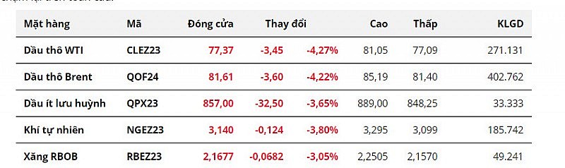 Kết thúc phiên giao dịch ngày 7/11, hai mặt hàng dầu thô đồng loạt giảm mạnh hơn 4%, mức giảm trong ngày lớn nhất trong vòng 1 tháng qua. Trong đó, dầu WTI giảm 4,27% xuống 77,37 USD/thùng, mức thấp nhất kể từ giữa tháng 6. Dầu Brent lần đầu tiên đóng cửa dưới 84 USD/thùng kể từ cuộc xung đột giữa Israel và Hamas, chốt phiên tại 81,61 USD/thùng, giảm 4,22%. Lo ngại về nhu cầu suy giảm, trong khi sản lượng dự kiến của Tổ chức các nước xuất khẩu dầu mỏ (OPEC) gia tăng, đã kéo giá dầu lao dốc.