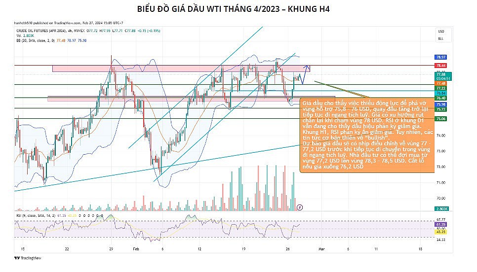 Về mặt kỹ thuật, giá dầu cho thấy việc thiếu động lực để phá vỡ vùng hỗ trợ 75,8 – 76 USD, quay đầu tăng trở lại tiếp tục đi ngang tích luỹ. Giá có xu hướng rút chân lại khi chạm vùng 78 USD. RSI ở khung D1 vẫn đang cho thấy dấu hiệu phân kỳ giảm giá. Khung H1, RSI phân kỳ ẩn giảm giá.