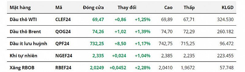 Chốt phiên, giá dầu WTI tăng 1,25% lên 69,47 USD/thùng. Dầu Brent đóng cửa tại 74,26 USD/thùng, tăng 1,39% so với phiên trước.