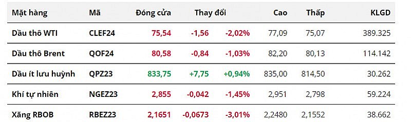 Cụ thể, giá dầu WTI ghi nhận phiên giảm thứ ba liên tiếp với mức giảm 2,02% xuống 75,54 USD/thùng. Dầu Brent chốt phiên tại 80,58 USD/thùng, giảm 1,03% so với phiên trước.