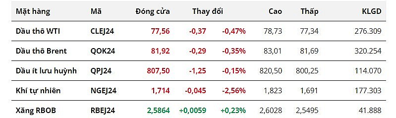Chốt phiên, giá dầu WTI ghi nhận phiên giảm thứ hai liên tiếp với mức giảm 0,47% xuống 77,56 USD/thùng. Dầu Brent giảm 0,35% xuống 81,92 USD/thùng.