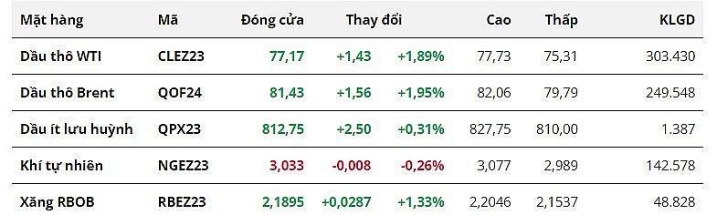 Cụ thể, giá dầu WTI tăng 1,89% lên 77,17 USD/thùng. Giá dầu Brent chốt phiên tại 81,43 USD/thùng, tăng 1,95% so với phiên trước.