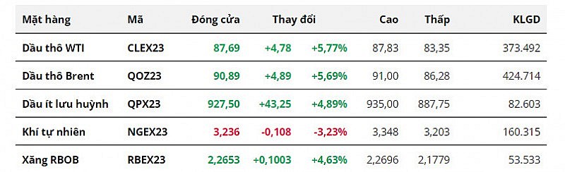 Khép lại phiên giao dịch cuối tuần ngày 13/10, giá dầu nhận được lực mua tích cực khi các nhà đầu tư lo ngại rằng xung đột Israel - Hamas có thể tiếp tục lan rộng, gây gián đoạn nguồn cung dầu ở Trung Đông. Giá dầu WTI tăng 5,77% lên 87,69 USD/thùng. Trong khi đó, giá dầu Brent tăng 5,69% lên 90,89 USD/thùng.
