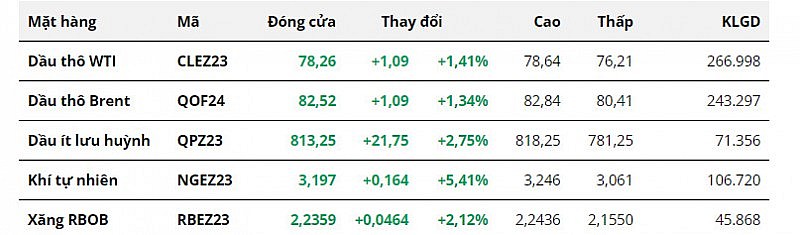 Cụ thể, giá dầu WTI ghi nhận phiên tăng thứ ba liên tiếp với mức tăng 1,41% lên 78,26 USD/thùng. Giá dầu Brent chốt phiên tại 82,52 USD/thùng, tăng 1,34% so với phiên trước.