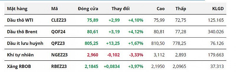 Cụ thể, giá dầu WTI tăng 4,1% lên 75,89 USD/thùng. Giá dầu Brent chốt phiên tại 80,61 USD/thùng, tăng 4,12% so với phiên trước.